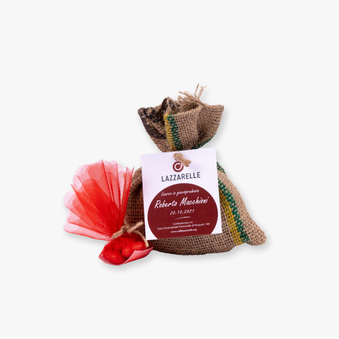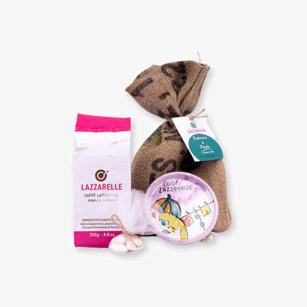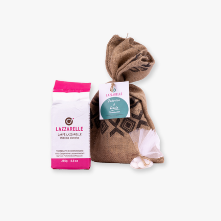 Confezione in juta con pacchetto di caffè Lazzarelle miscela classica da 250 g, confetti.