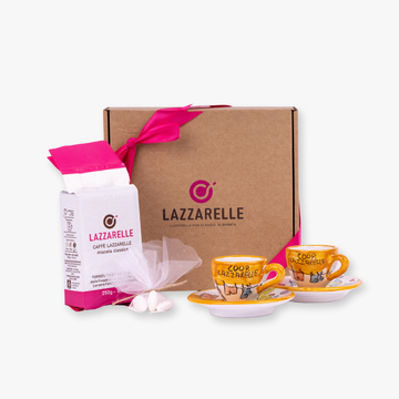 Scatola con pacchetto di caffè Lazzarelle miscela classica da 250g, confetti, coppia di tazzine con piattino modellate e dipinte a mano da un ceramista di Vietri.