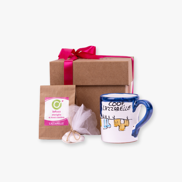 Scatola con pacchetto di tè o tisana Lazzarelle da 50 g, confetti, tazza mug modellata e dipinta a mano da un ceramista di Vietri.
