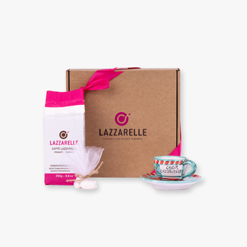 Scatola con pacchetto di caffè Lazzarelle miscela classica da 250g, confetti, tazzina con piattino modellata e dipinta a mano da un ceramista di Vietri.