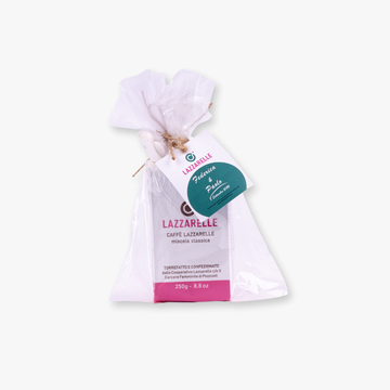 Pacchetto di caffè Lazzarelle miscela classica da 250 g confezionato in cellophane con confetti.